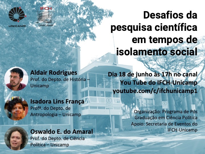 O Programa de Pós-Graduação em Ciência Política promove o debate Desafios da Pesquisa Científica em Tempos de Isolamento Social, dia 18 de junho, às 17 horas no canal do IFCH Unicamp no Youtube.