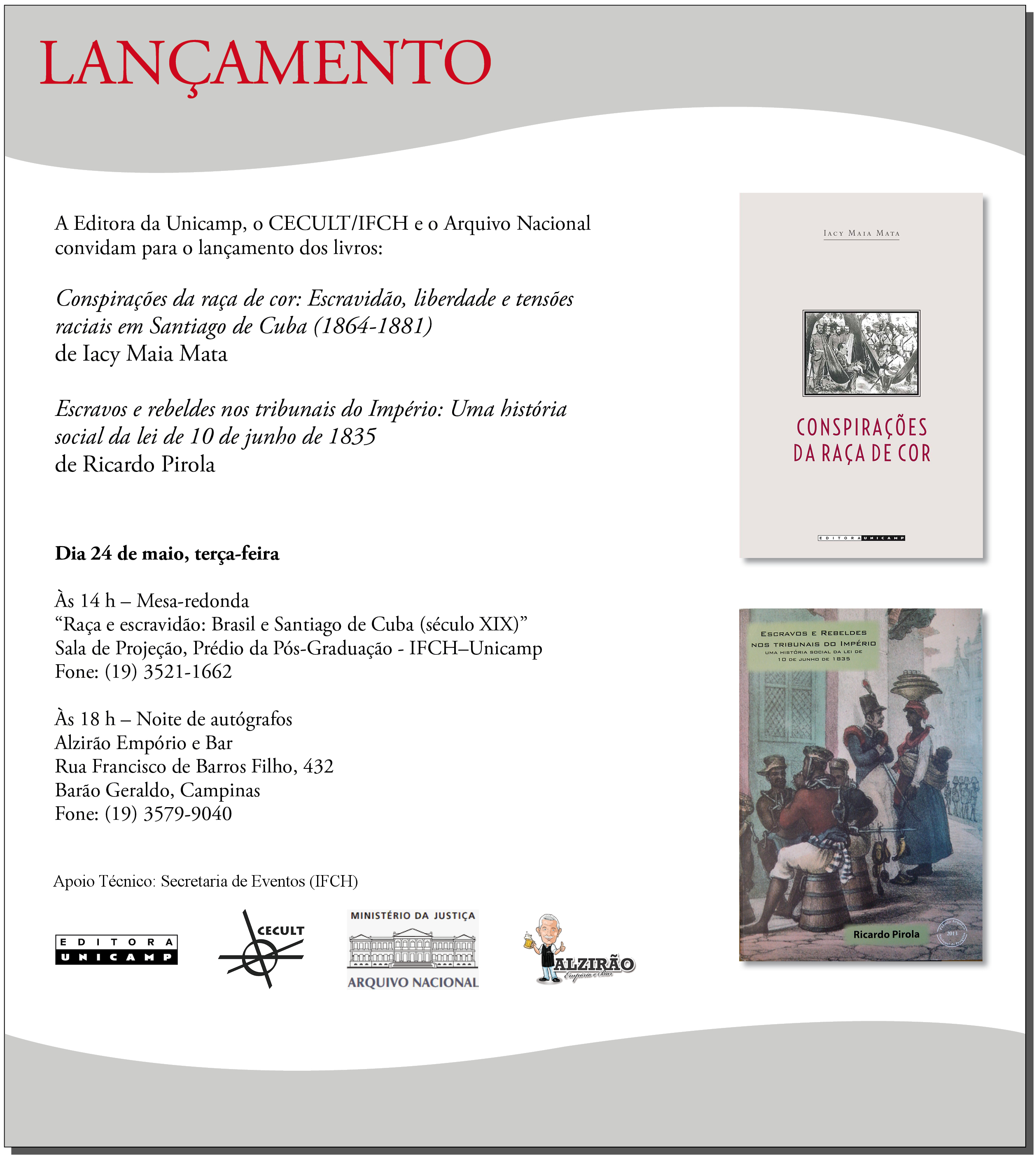 Apoio: FAPESP, CAPES, Rice University, Programa de Pós-Graduação de História (IFCH) e Centro de Pesquisa em História Social da Cultura (CECULT/IFCH)