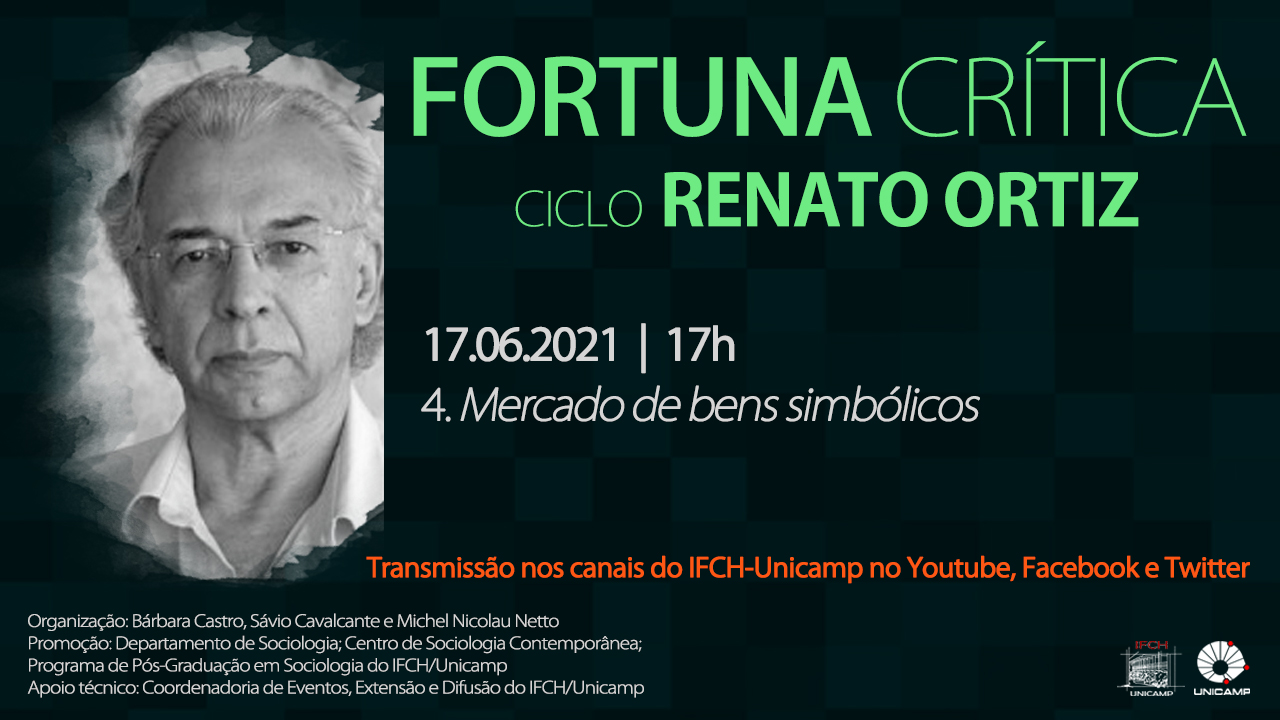 O próximo encontro do projeto Fortuna Crítica: Ciclo Renato Ortiz terá como tema Mercado de bens simbólicos, dia 17 de junho às 17 horas nos canais do IFCH Unicamp no Youtube, Facebook e Twitter.