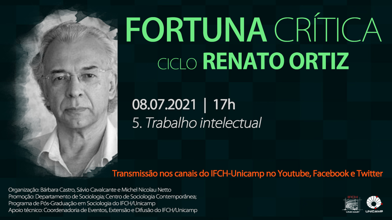 O próximo encontro do projeto Fortuna Crítica: Ciclo Renato Ortiz terá como tema Trabalho intelectual, dia 08 de julho às 17 horas nos canais do IFCH Unicamp no Youtube, Facebook e Twitter.