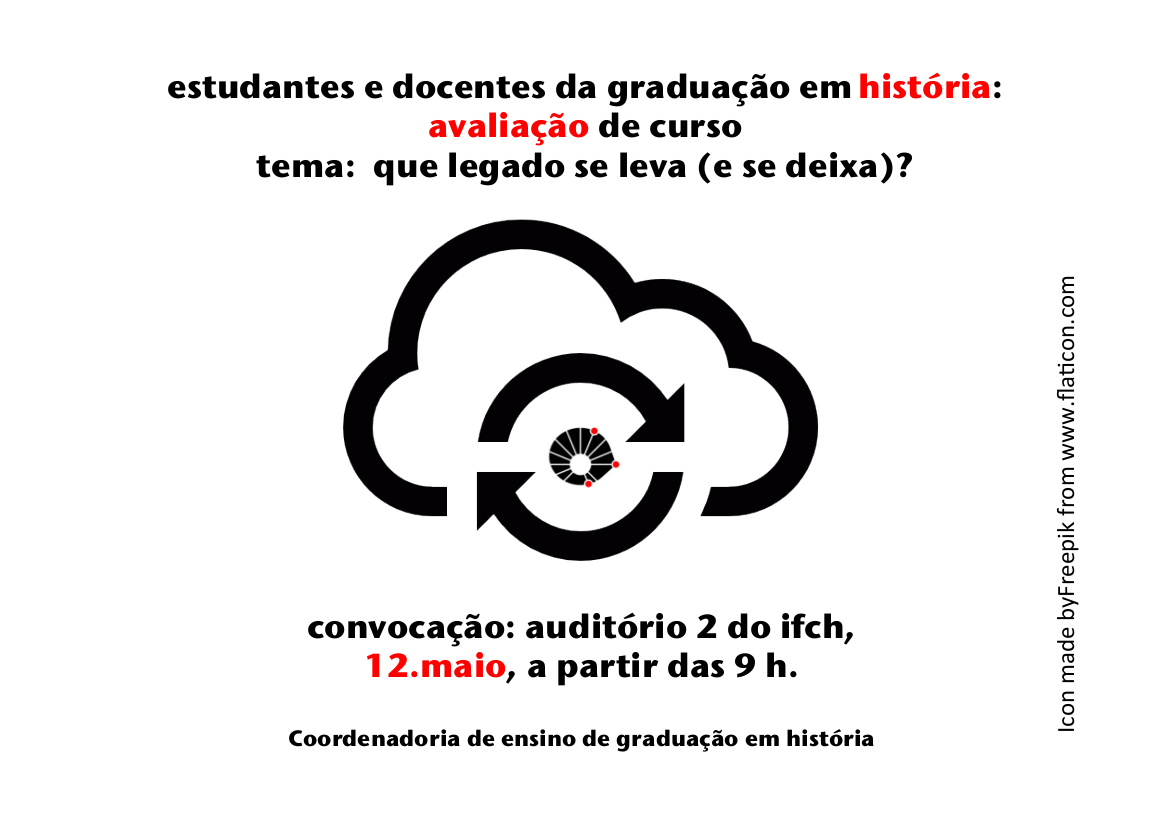 A Coordenação de Graduação em História convoca os estudantes para participarem, na próxima terça-feira, 12 de maio de 2015, no Auditório II, da avaliação de curso, cujo tema é: "Que legado se leva (e se deixa)?"