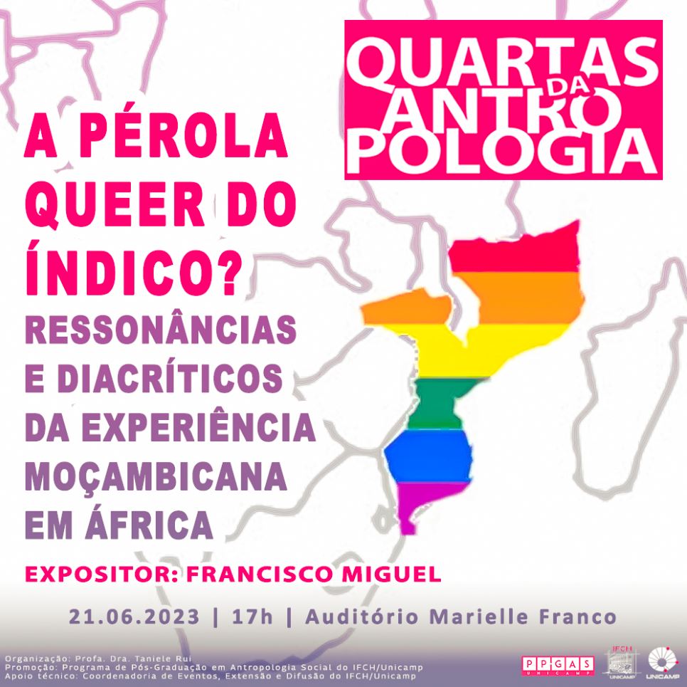 As Quartas de Antropologia de junho terão como tema A Pérola Queer do Índico - Ressonâncias e diacríticos da experiência moçambicana em África, dia 21 de junho às 17 horas no Auditório Marielle Franco. O encontro contará com a exposição do Francisco Miguel.