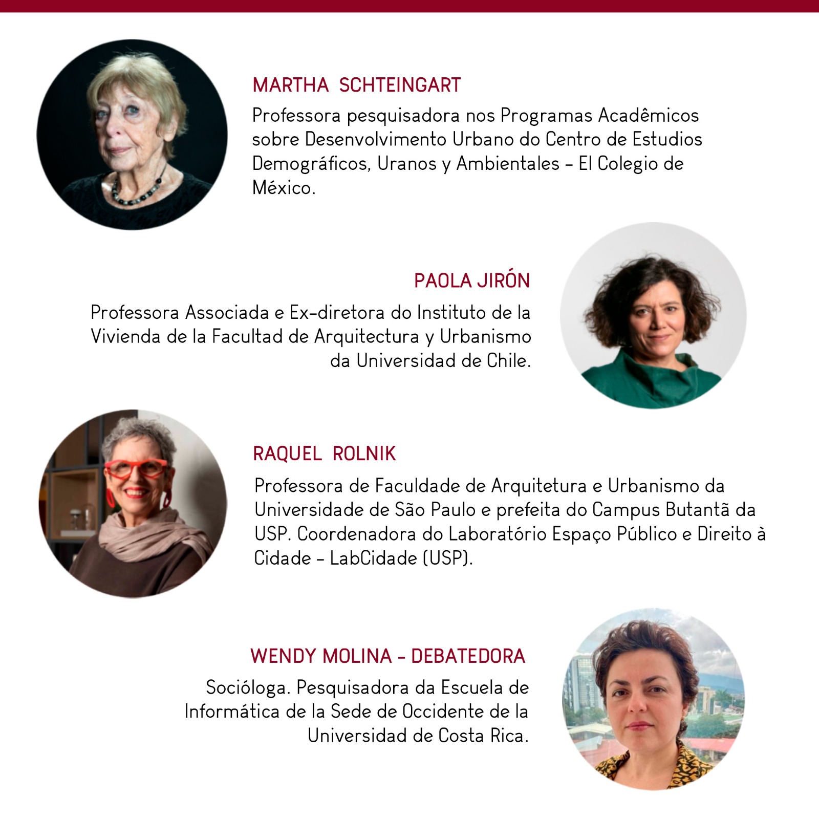 O webinar contará com a participação de Martha Schteingart, professora do Centro de Estudios Demográficos, Urbanos y Ambientales do El Colegio de México; Paola Jirón, professora associada da Faculdade de Arquitetura e Urbanismo da Universidad de Chile e diretora do Núcleo Milenio Movilidades y Territorios (MOVYT); e Raquel Rolnik, professora da Faculdade de Arquitetura e Urbanismo da Universidade de São Paulo (USP) e coordenadora do Laboratório Espaço Público e Direito à Cidade (LabCidade).