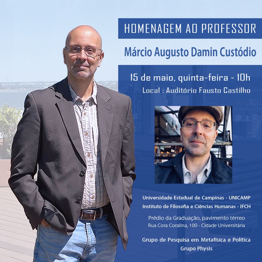 Os membros do Grupo de Pesquisa em Metafísica e Política e do Grupo Physis convidam a comunidade acadêmica para a homenagem ao professor Márcio Damin. O encontro será realizado no dia 15 de maio (quinta-feira), às 10 horas, no Auditório Fausto Castilho, no IFCH.