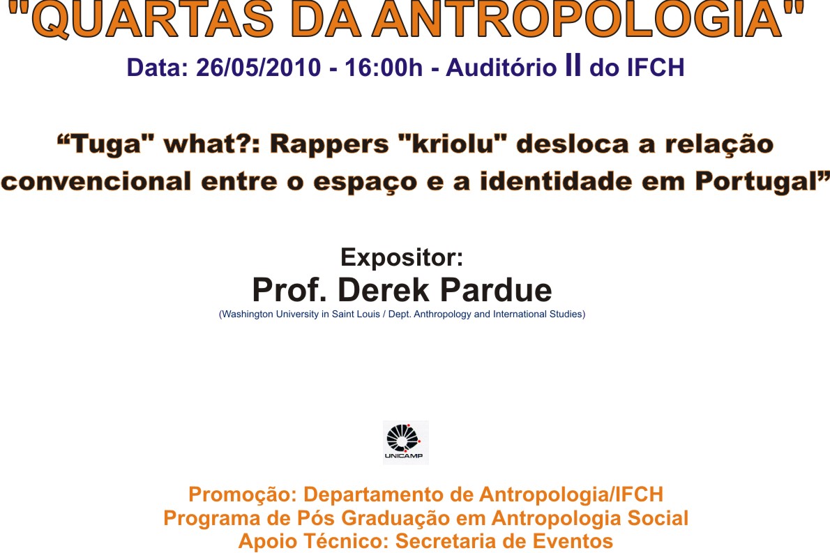 "QUARTAS DA ANTROPOLOGIA" Data: 26/05/2010 - 16:00h - Auditório II do IFCH “TUGA" WHAT?: RAPPERS "KRIOLU" DESLOCA A RELAÇÃO CONVENCIONAL ENTRE O ESPAÇO E A IDENTIDADE EM PORTUGAL” Expositor: Prof. Derek Pardue (Washington University in Saint Louis / Dept.