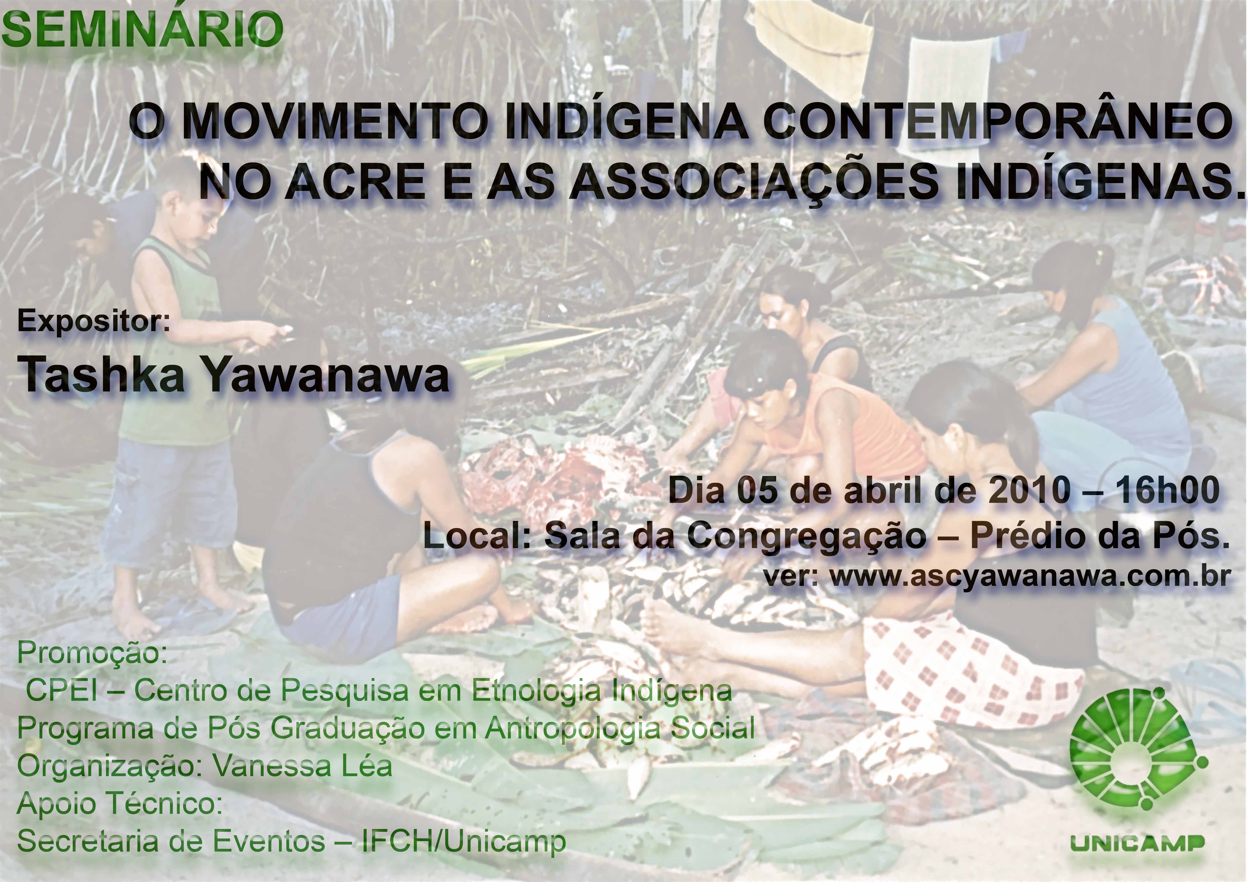 Seminário O MOVIMENTO INDÍGENA CONTEMPORÂNEO NO ACRE E AS ASSOCIAÇÕES INDÍGENAS. Expositor: Tashka Yawanawa Dia 05 de abril de 2010 – 16h00 Local: Sala da Congregação – Prédio da Pós.