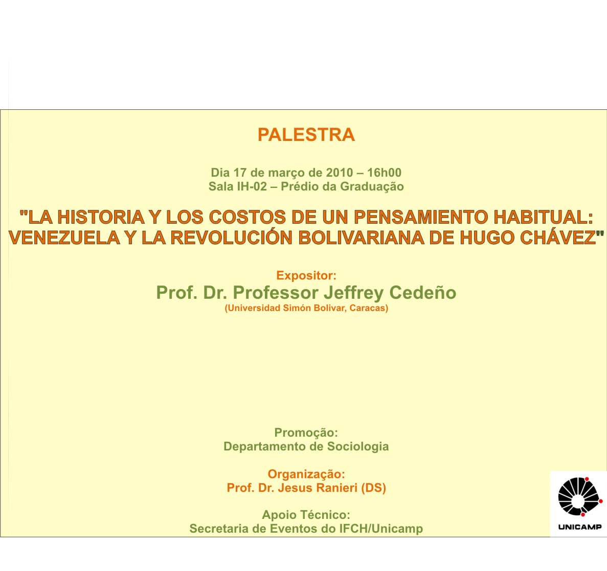 PALESTRA Dia 17 de março de 2010 – 16h00 Sala IH-02 – Prédio da Graduação \\\\\\\"LA HISTORIA Y LOS COSTOS DE UN PENSAMIENTO HABITUAL: VENEZUELA Y LA REVOLUCIÓN BOLIVARIANA DE HUGO CHÁVEZ\\\\\\\" Expositor: Prof. Dr. Professor Jeffrey Cedeño (Universidad Simón Bolivar, Caracas) Promoção: Departamento de Antropologia Organização: Prof. Dr.