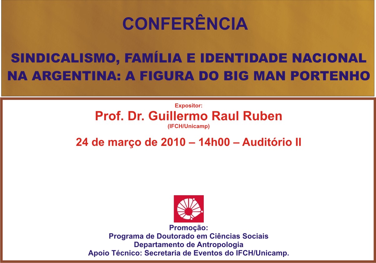 Conferência: Sindicalismo, Família e Identidade Nacional na Argentina: A Figura do Big Man portenho. Expositor: Prof. Dr. Guillermo Raul Ruben (IFCH/UNICAMP) Promoção: Programa de Pós Graduação em Ciências Sociais Departamento de Antropologia (IFCH/Unicamp) Apoio Técnico: Secretaria de Eventos do IFCH