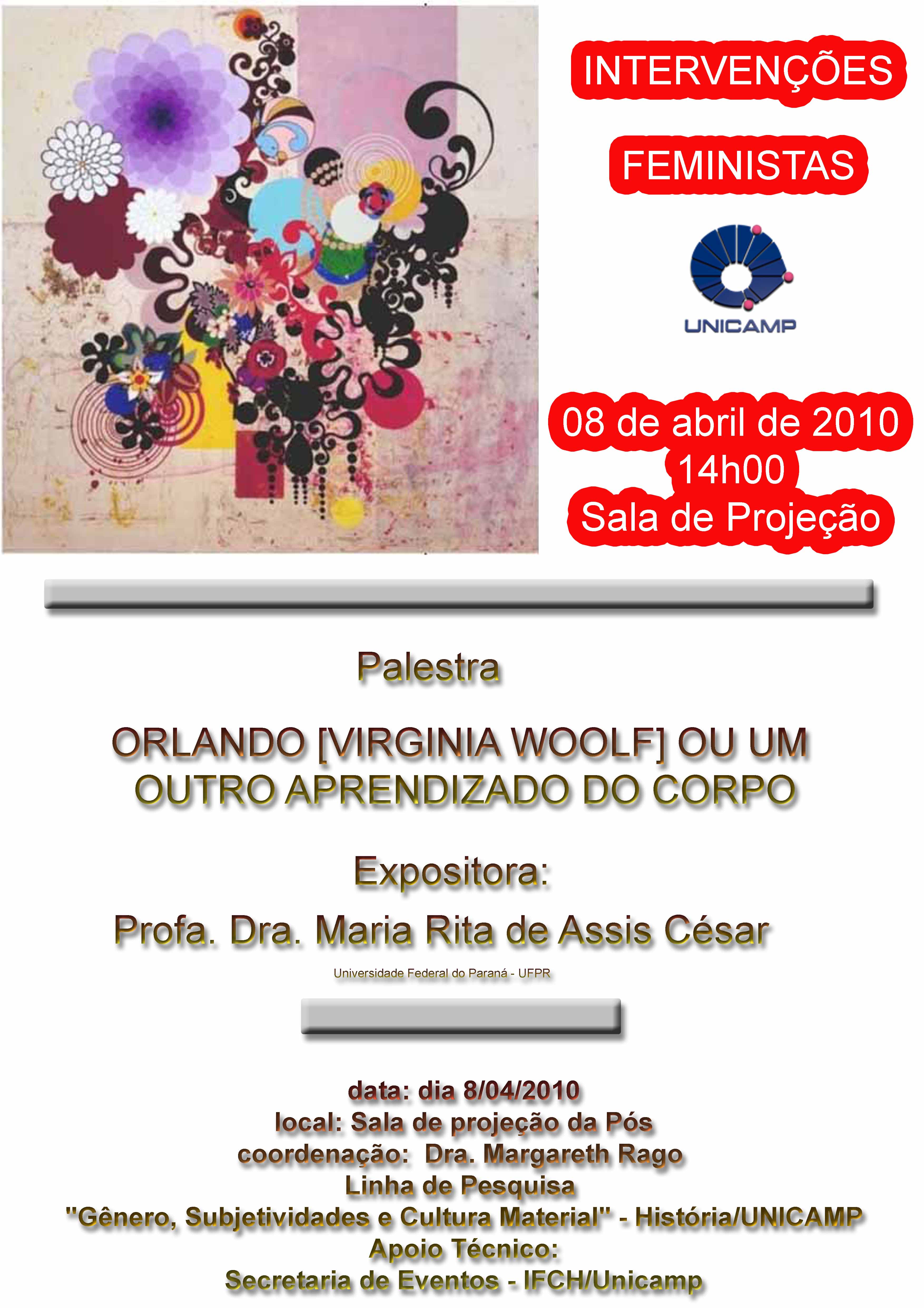 INTERVENÇÕES FEMINISTAS Data: dia 8/04/2010 Local: Sala de projeção – Prédio da Pós Título ORLANDO [VIRGINIA WOOLF] OU UM OUTRO APRENDIZADO DO CORPO Expositora Dra. Maria Rita de Assis César Universidade Federal do Paraná - UFPR Coordenação: Profa. Dra.
