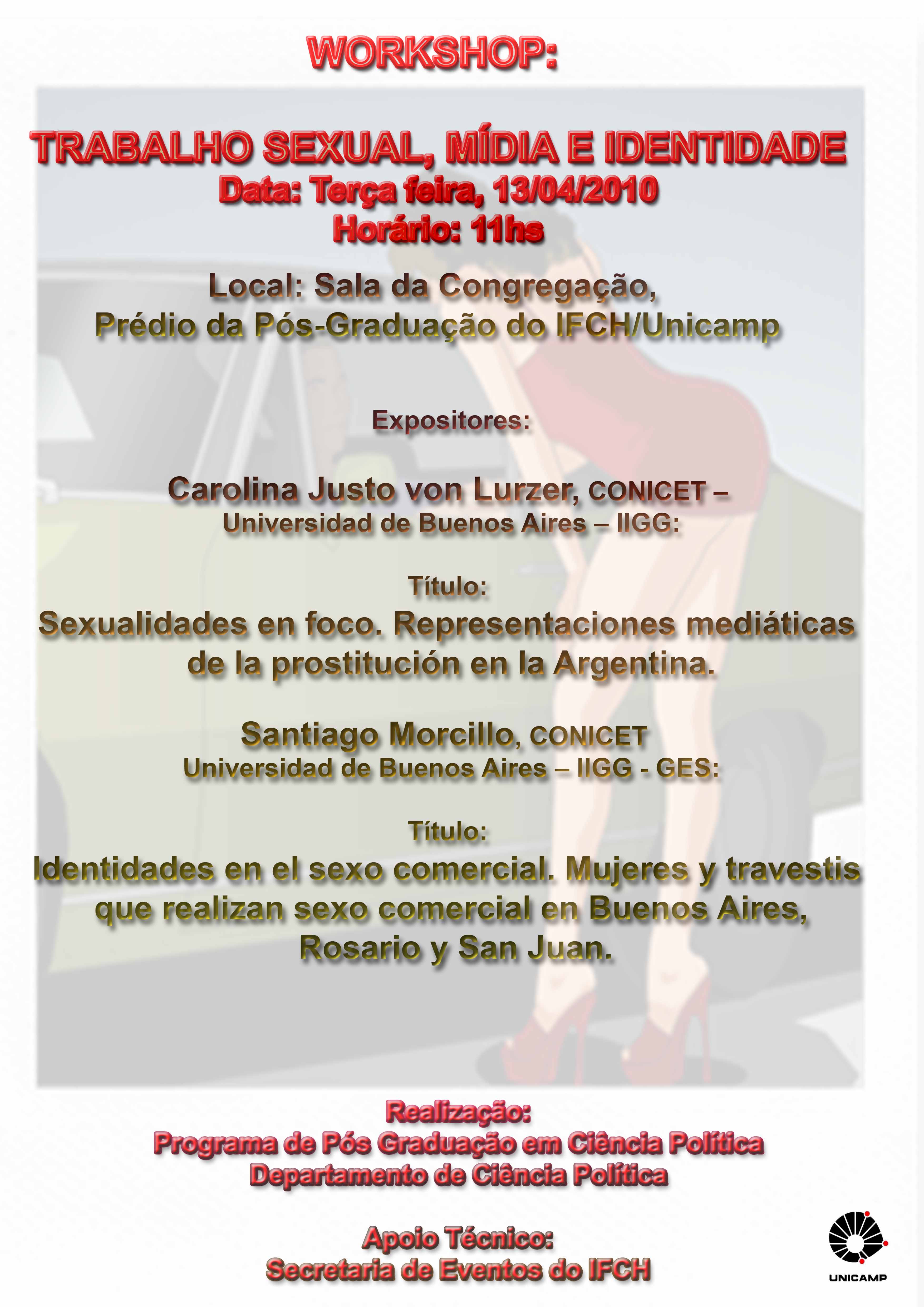 WORKSHOP: TRABALHO SEXUAL, MÍDIA E IDENTIDADE Data: Terça feira, 13/04/2010 Horário: 11hs Local: Sala da Congregação, Prédio da Pós-Graduação do IFCH/Unicamp Expositores: Carolina Justo von Lurzer, CONICET – Universidad de Buenos Aires – IIGG: Título: Sexualidades en foco. Representaciones mediáticas de la prostitución en la Argentina.