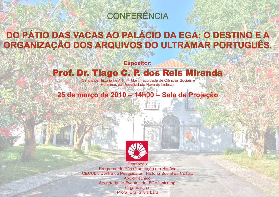 25/03/2010 - Conferência: Do Pátio das Vacas ao Palácio da Ega: O Destino e a organização dos Arquivos do Ultramar Português Expositor: Prof. Dr. Tiago C. P. dos Reis Miranda (Univ. Nova de Lisboa) Promoção: Programa de Pós Graduação em História CECULT: Centro de Pesquisa em História Social da Cultura Apoio Técnico: Secretaria de Eventos do IFCH/Unicamp.