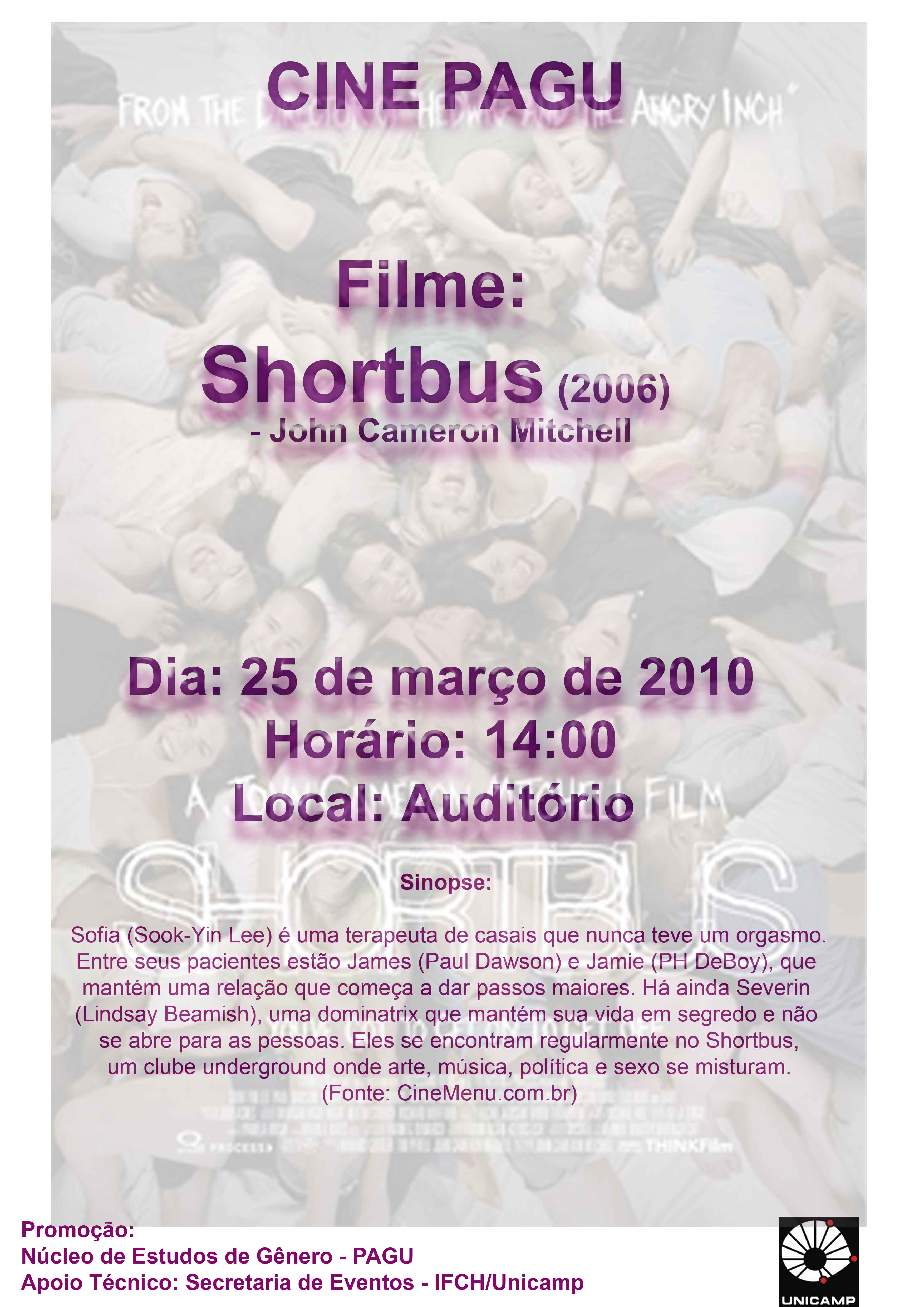 Filme: Shortbus (2006) - John Cameron Mitchell Dia: 25 de março de 2010 Horário: 14:00 Local: Auditório 1 Sinopse: Sofia (Sook-Yin Lee) é uma terapeuta de casais que nunca teve um orgasmo. Entre seus pacientes estão James (Paul Dawson) e Jamie (PH DeBoy), que mantém uma relação que começa a dar passos maiores.