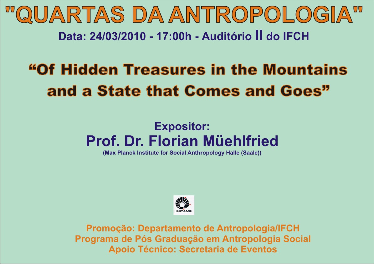Quartas da Antropologia - 24/03/2010 - 17h00 - Auditório II do IFCH. Titulo: “Of Hidden Treasures in the Mountains and a State that Comes and Goes” Expositor: Prof. Dr. Florian Müehlfried (Max Planck Institute for Social Anthropology Halle (Saale)) Promoção: Departamento de Antropologia Programa de Pós Graduação em Antropologia Social. Organização: Prof. Dr. Ronaldo Rômulo M.