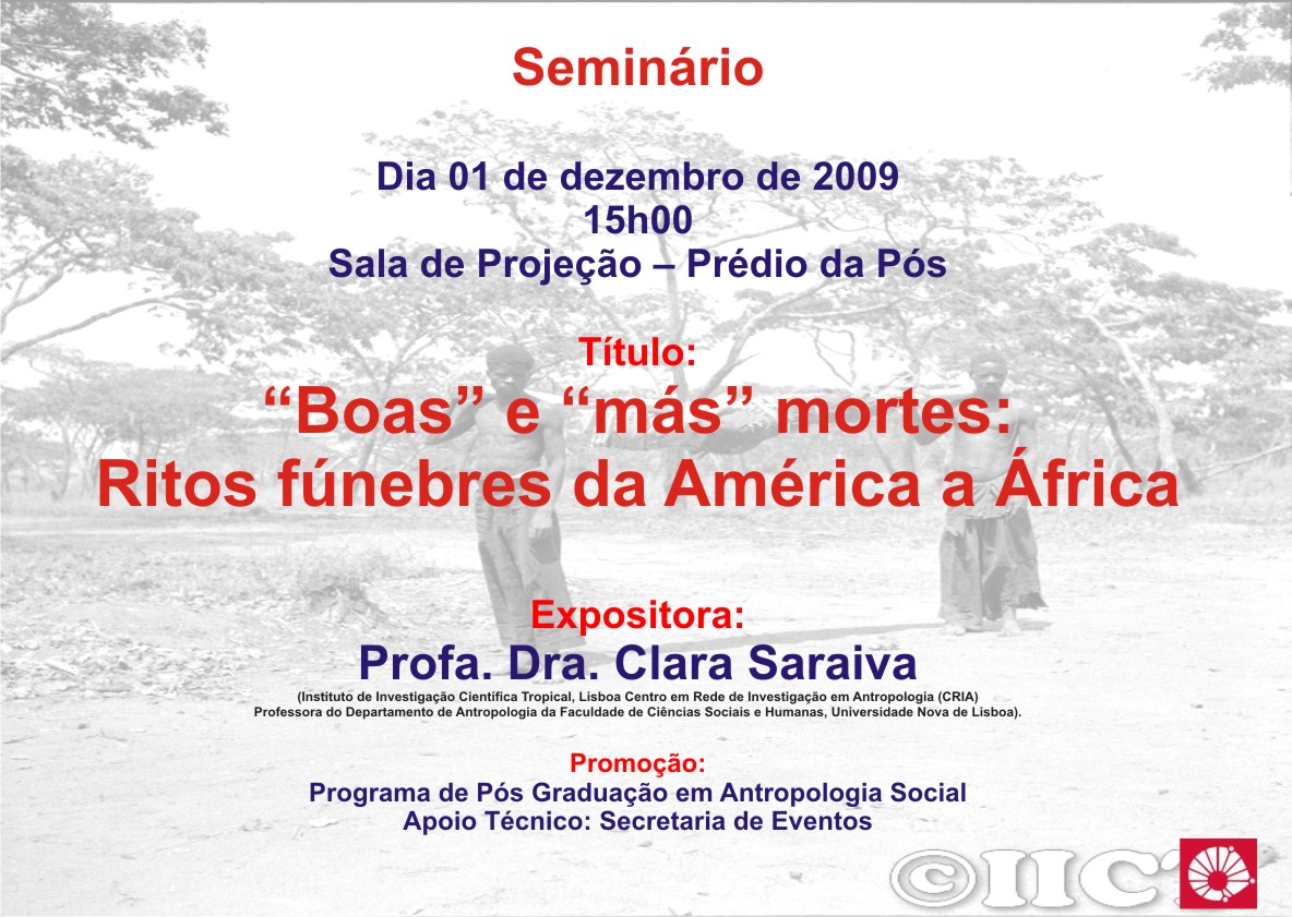 Seminário Dia 01 de dezembro de 2009 15h00 Sala de Projeção – Prédio da Pós Título: “Boas” e “más” mortes: Ritos fúnebres da América a África Expositora: Profa. Dra.