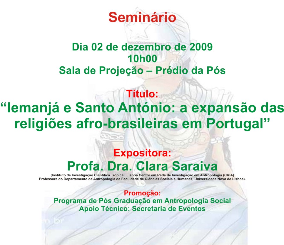 Seminário Dia 02 de dezembro de 2009 10h00 - Sala da Congregação – Prédio da Pós Título: “Iemanjá e Santo António: a expansão das religiões afro-brasileiras em Portugal” Expositora: Profa. Dra.