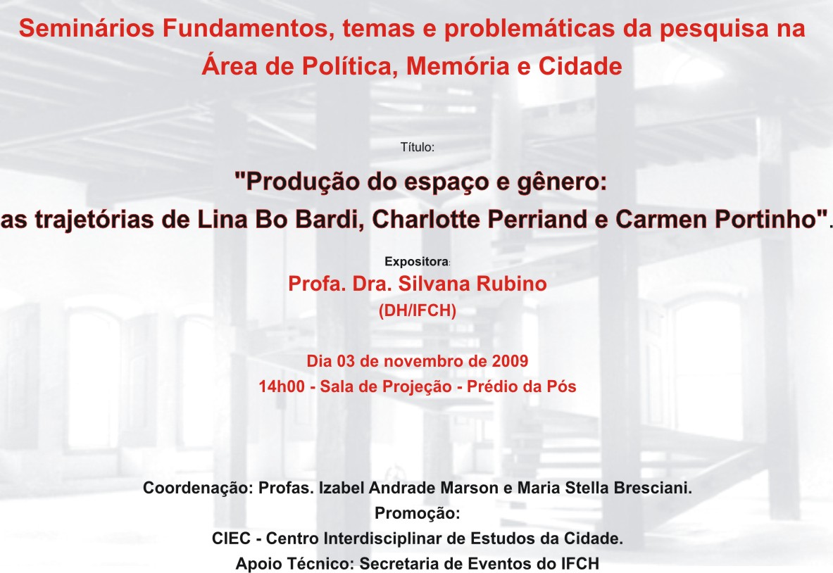 Seminários Fundamentos, temas e problemáticas da pesquisa na Área de Política, Memória e Cidade Título: \\\"Produção do espaço e gênero: as trajetórias de Lina Bo Bardi, Charlotte Perriand e Carmen Portinho\\\". Expositora: Profa. Dra. Silvana Rubino (DH/IFCH) Coordenação: Profas. Izabel Andrade Marson e Maria Stella Bresciani.