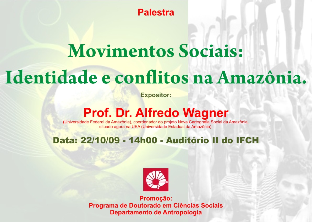 Palestra MOVIMENTOS SOCIAIS: IDENTIDADE E CONFLITOS NA AMAZÔNIA. Expositor: Prof. Dr. Alfredo Wagner (Universidade Federal da Amazônia), coordenador do projeto Nova Cartografia Social da Amazônia, situado agora na UEA (Universidade Estadual da Amazônia). Data: 22/10/09 - 14h00 - Auditório II do IFCH Promoção: Programa de Doutorado em Ciências Sociais Departamento de Antropologia