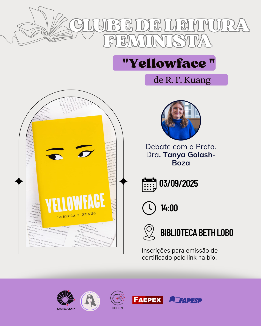 O Núcleo de Estudos de Gênero – Pagu promove, no dia 3 de setembro de 2025, às 14h, mais um encontro do Clube de Leitura Feminista, que desta vez terá como obra em debate o livro Yellowface, da escritora R. F. Kuang. A atividade acontece na Biblioteca Beth Lobo e contará com a presença especial da Profa. Dra. Tanya Golash-Boza (University of California).