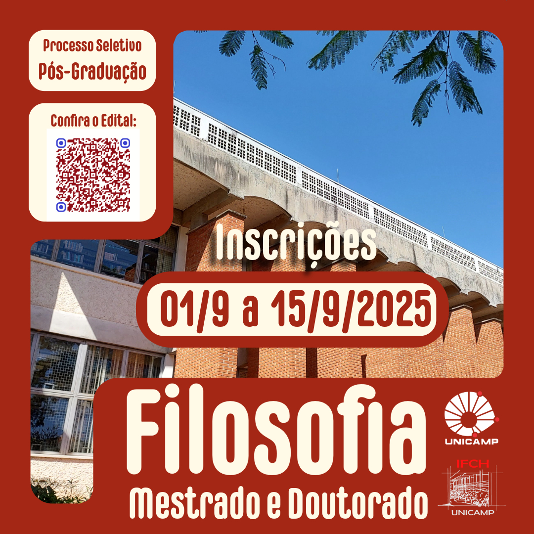 O Programa de Pós-Graduação em Filosofia do Instituto de Filosofia e Ciências Humanas da Unicamp abre, entre os dias 1º e 15 de setembro de 2025, as inscrições para o processo seletivo dos cursos de Mestrado e Doutorado.
